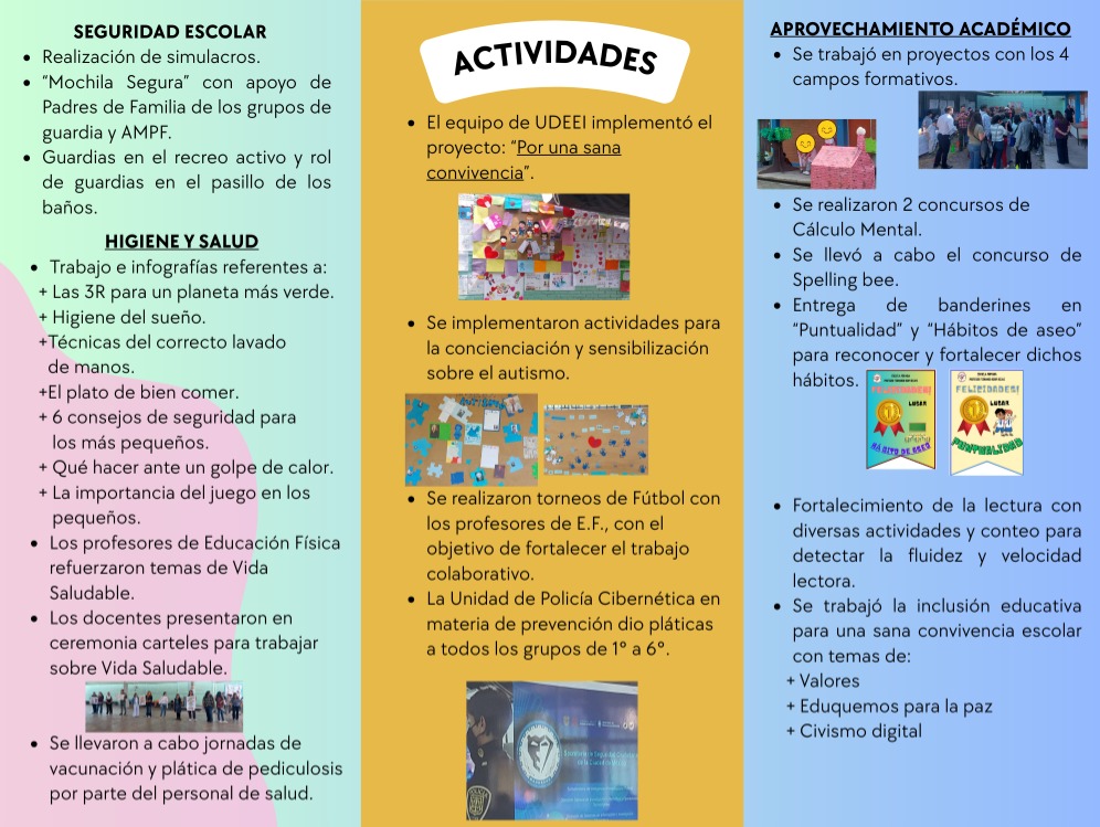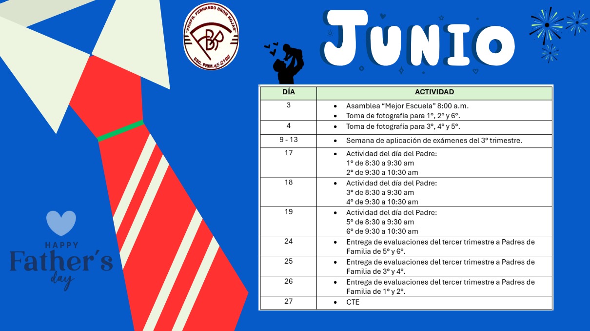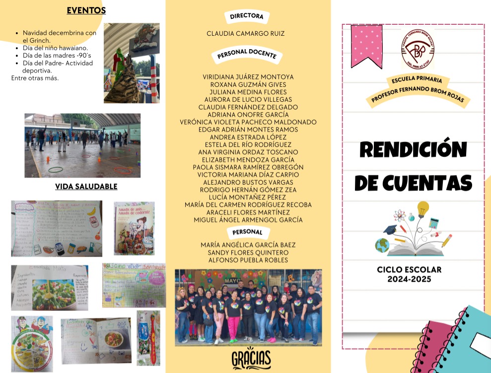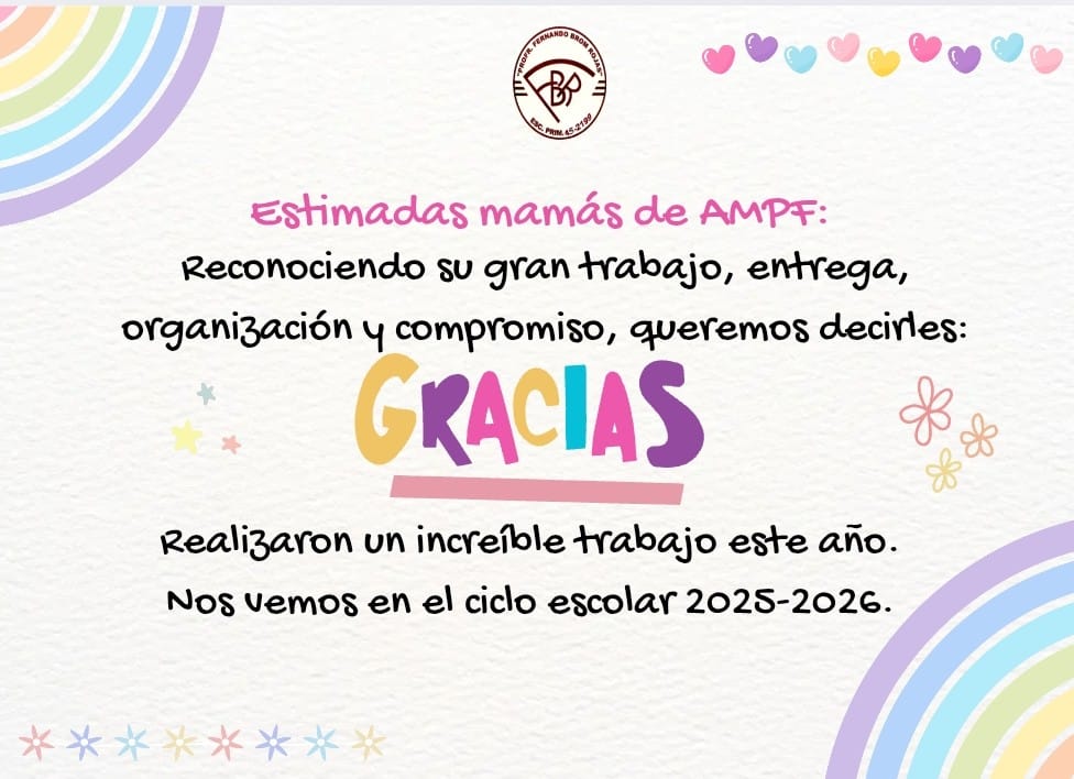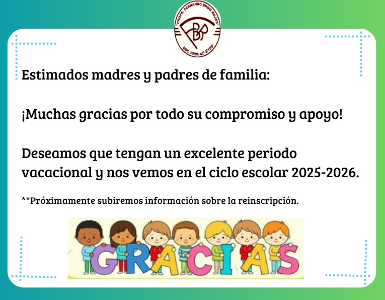 Por este medio se les informa que se dio por clausurado el ciclo escolar 2024 - 2025, agradeciéndoles como siempre su cooperación y apoyo. Disfruten sus vacaciones. Así mismo, se les da a conocer la rendición de cuentas.