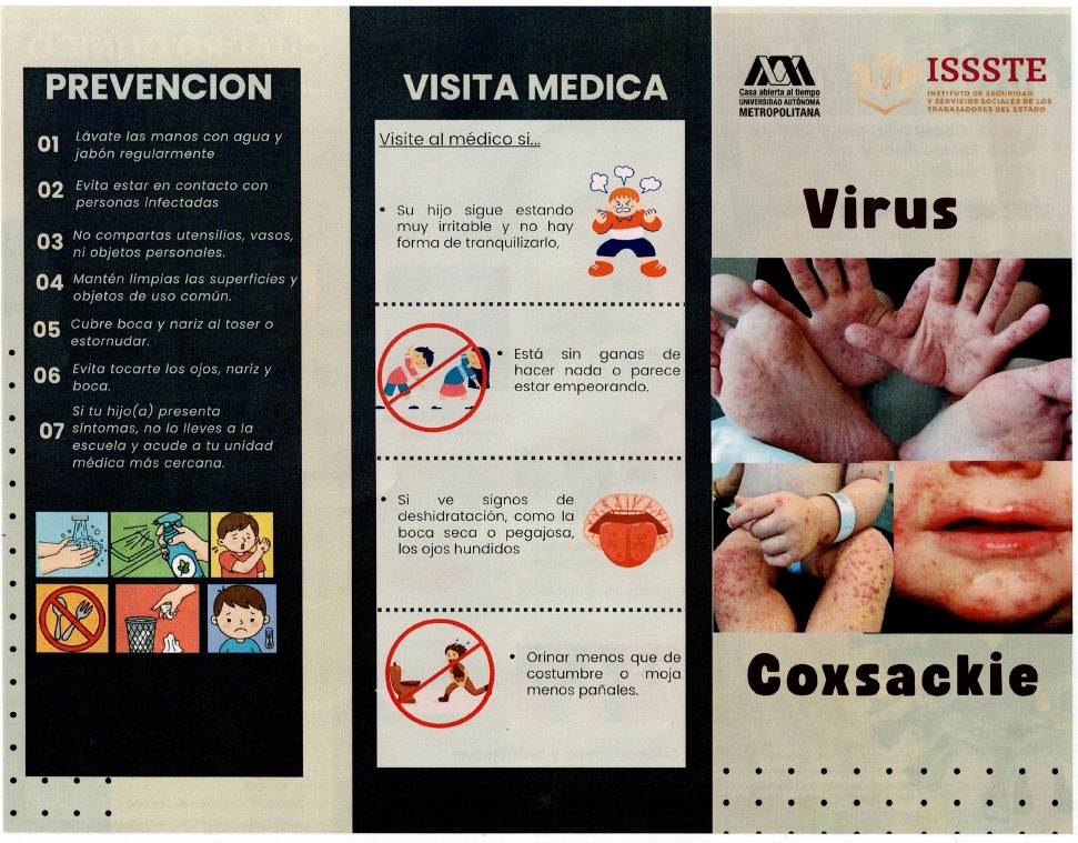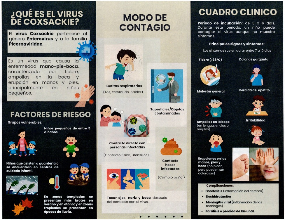 Por favor, si los niños tienen malestar, tos, dolor de garganta, pérdida de apetito y ampollas, favor de no enviarlos a la escuela y asistir a su clínica para evitar contagios, así como notificar a la escuela, ya que a su vez nosotros tenemos que informar a la jurisdicción sanitaria correspondiente. Se comparte tríptico informativo sobre el Virus Coxsackie.