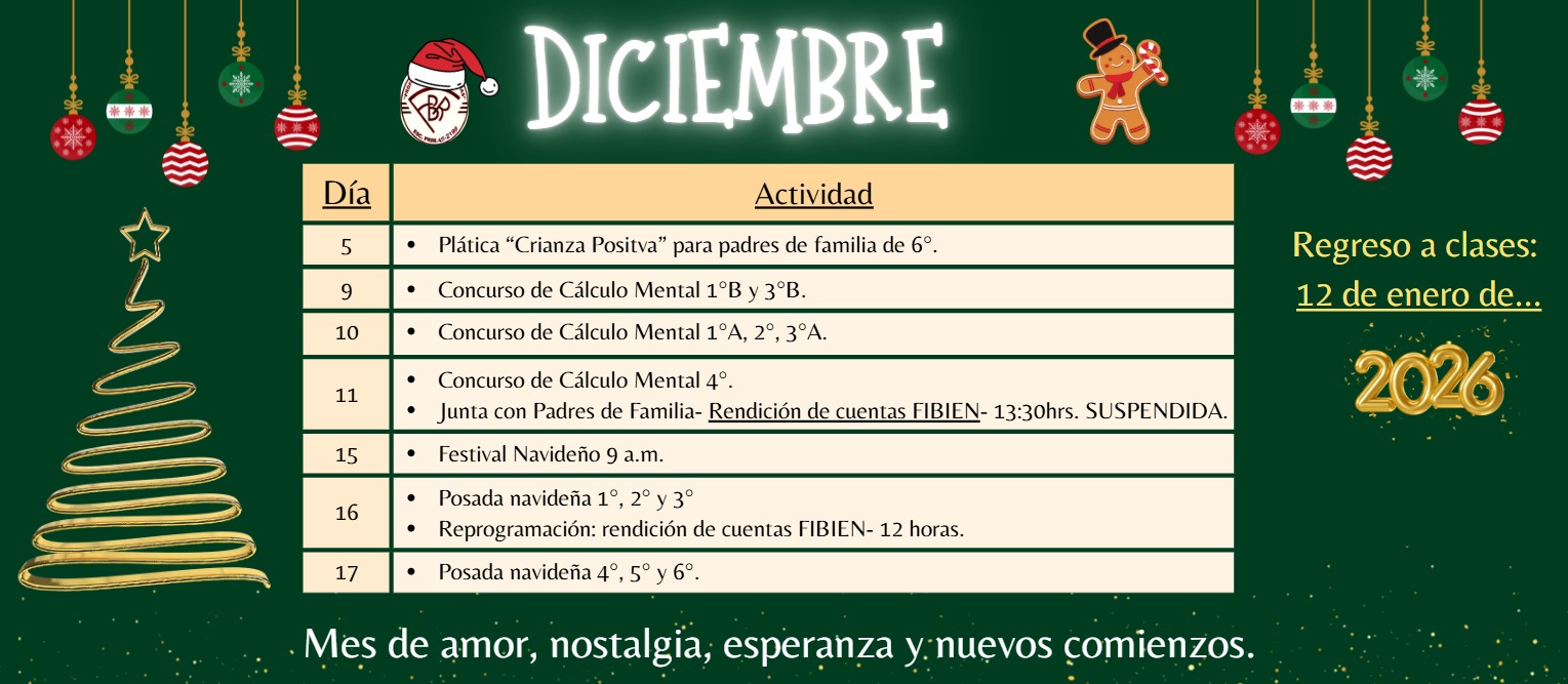 Se les da a conocer las actividades que se llevarán a cabo en el mes de Diciembre.